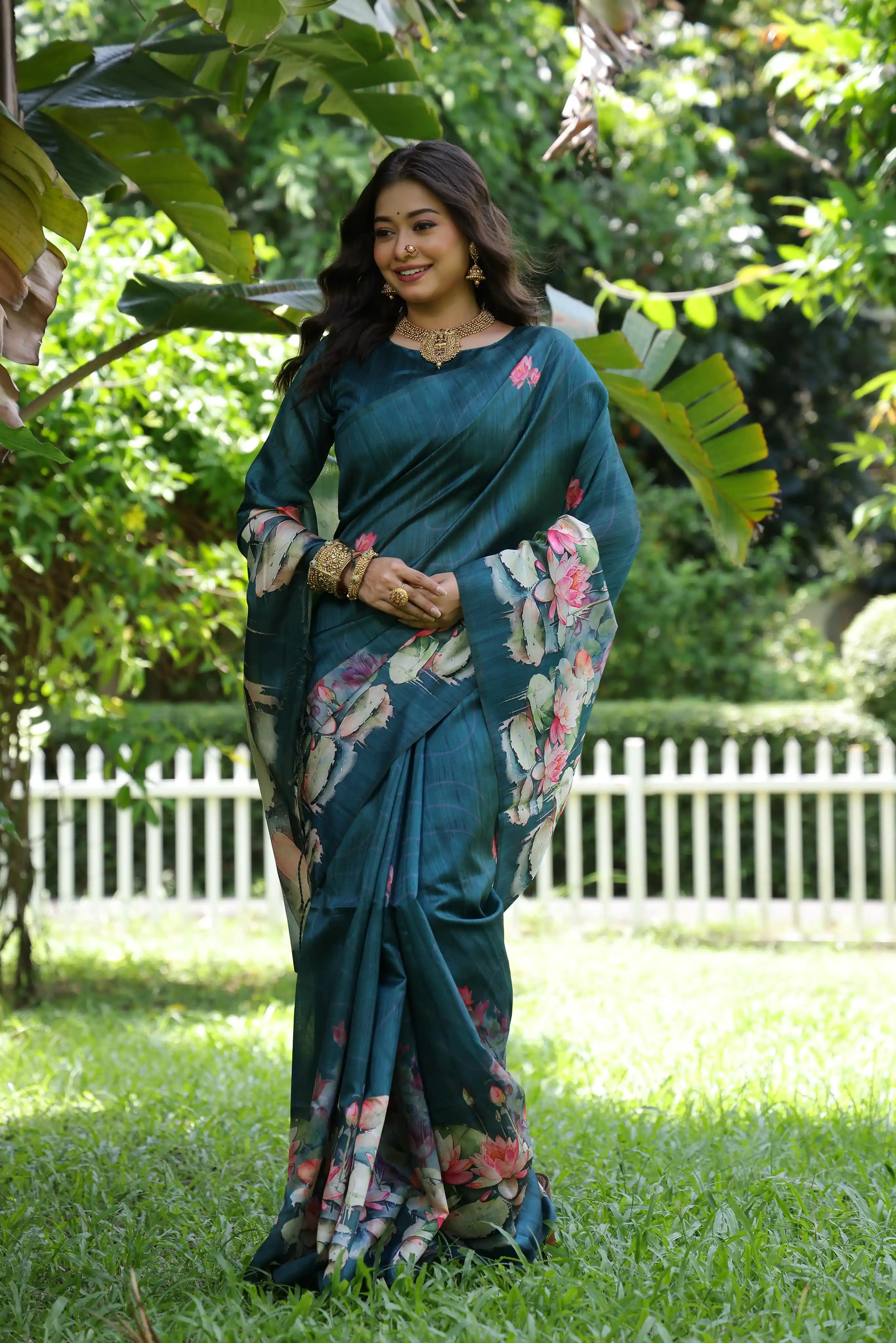 Soft Tussar Silk Saree with Lotus Print - RAMA